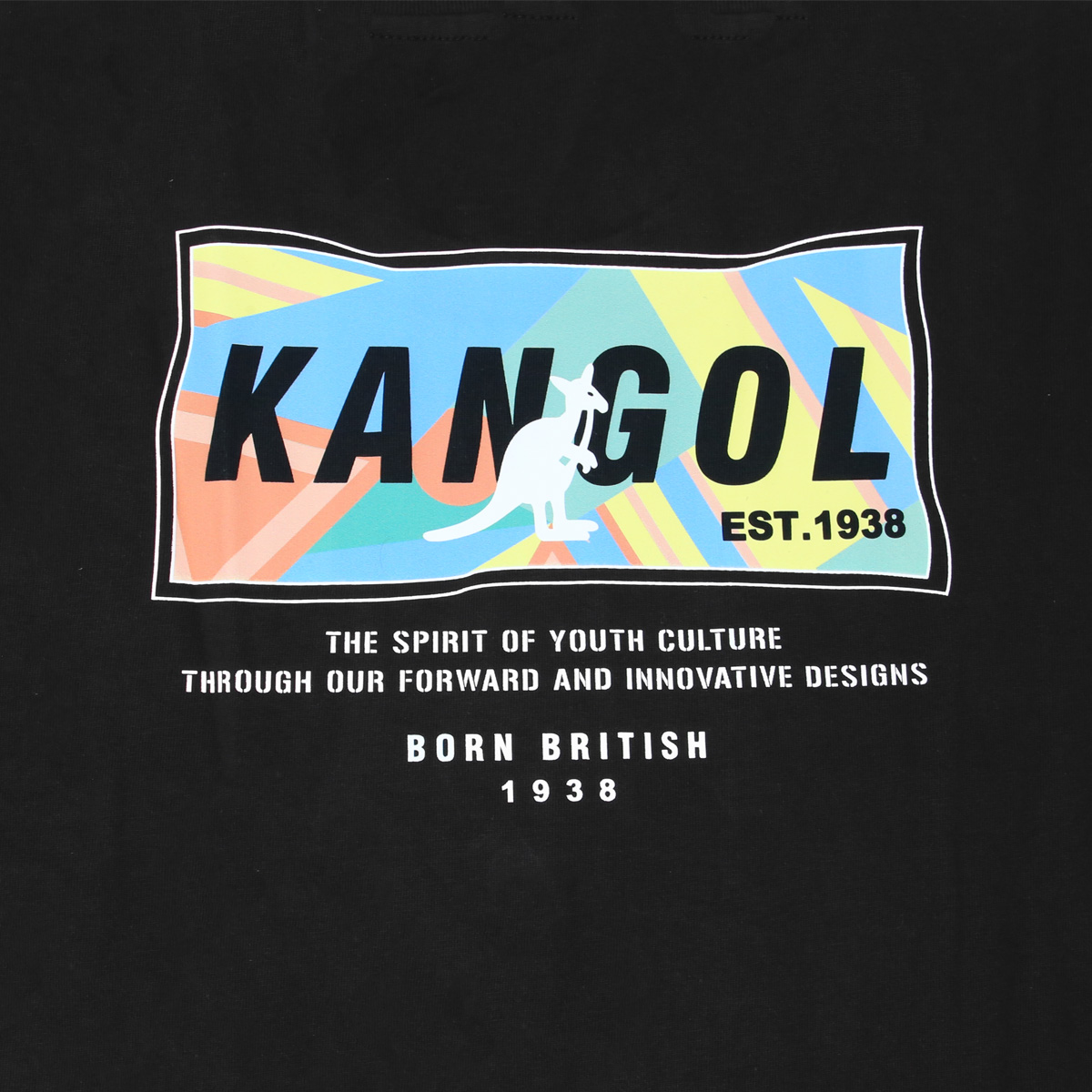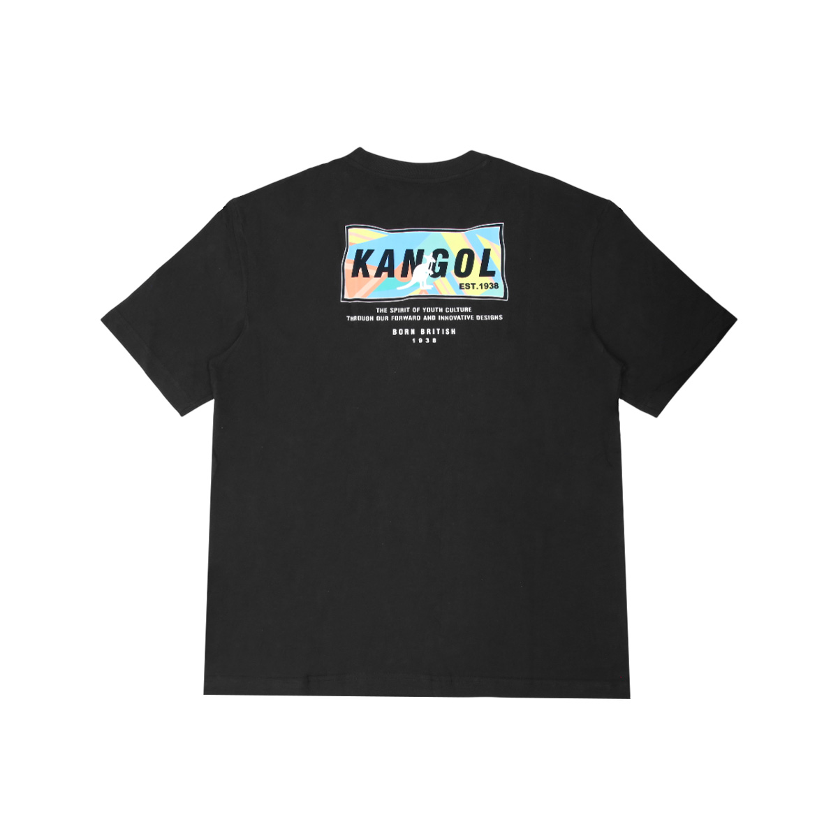 Chiếc áo thun Kangol phối màu đen và họa tiết màu sắc mang đến một sự kết hợp hài hòa giữa sự đơn giản và nổi bật. Mặt trước giữ nét tối giản với logo kangaroo nhỏ in trên ngực trái, như một lời chào thương hiệu nhẹ nhàng và tinh tế. Tuy nhiên, điểm nhấn thực sự nằm ở mặt sau – nơi hội tụ của những mảng màu phối sắc sảo, kết hợp cùng typography hiện đại và dòng chữ “Born British”.