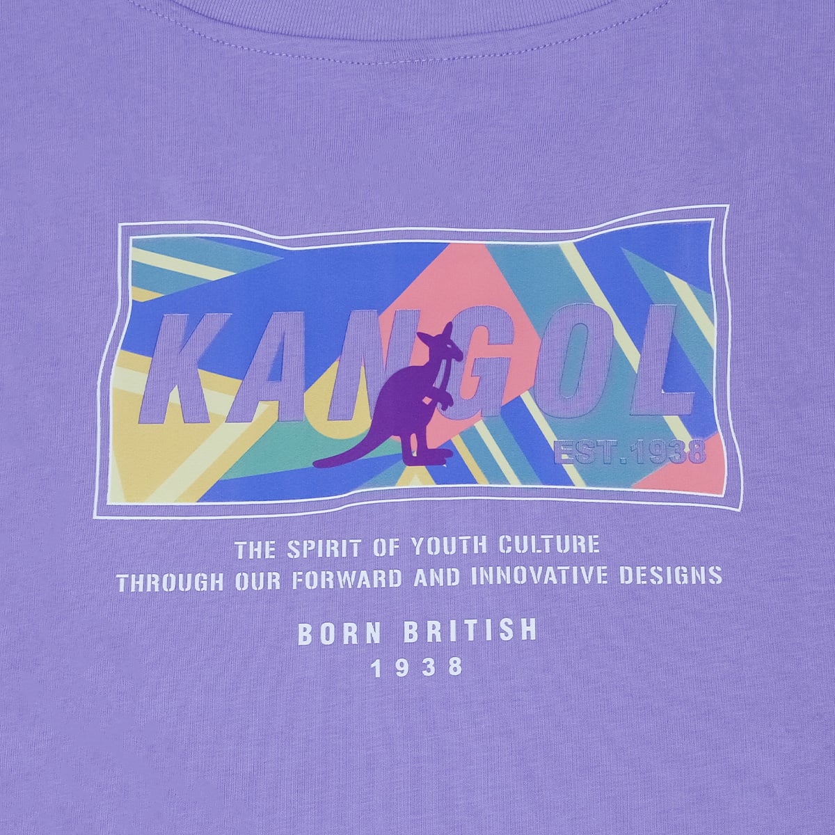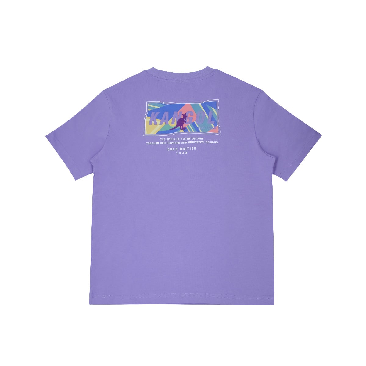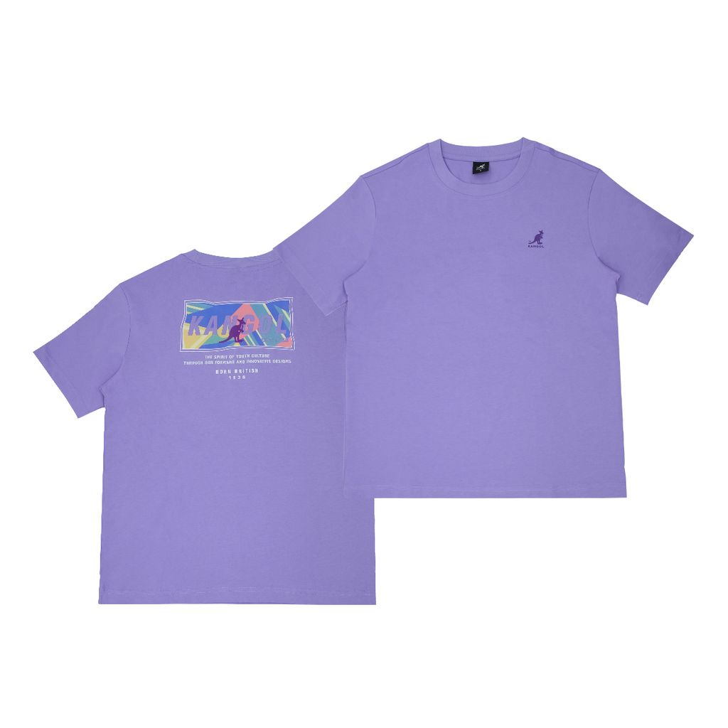 Chiếc áo thun Kangol phối màu tím pastel mang đến một sự kết hợp hài hòa giữa sự đơn giản và nổi bật. Mặt trước giữ nét tối giản với logo kangaroo nhỏ in trên ngực trái, như một lời chào thương hiệu nhẹ nhàng và tinh tế. Tuy nhiên, điểm nhấn thực sự nằm ở mặt sau – nơi hội tụ của những mảng màu phối sắc sảo, kết hợp cùng typography hiện đại và dòng chữ “Born British” – tuyên ngôn thẳng thắn thể hiện tinh thần di sản của Kangol.