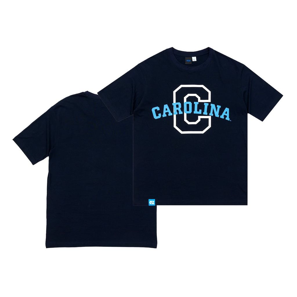 Thiết kế thời trang: Áo thun ngắn tay với màu xanh đậm và logo trắng lớn của đội North Carolina, thể hiện phong cách thể thao năng động.