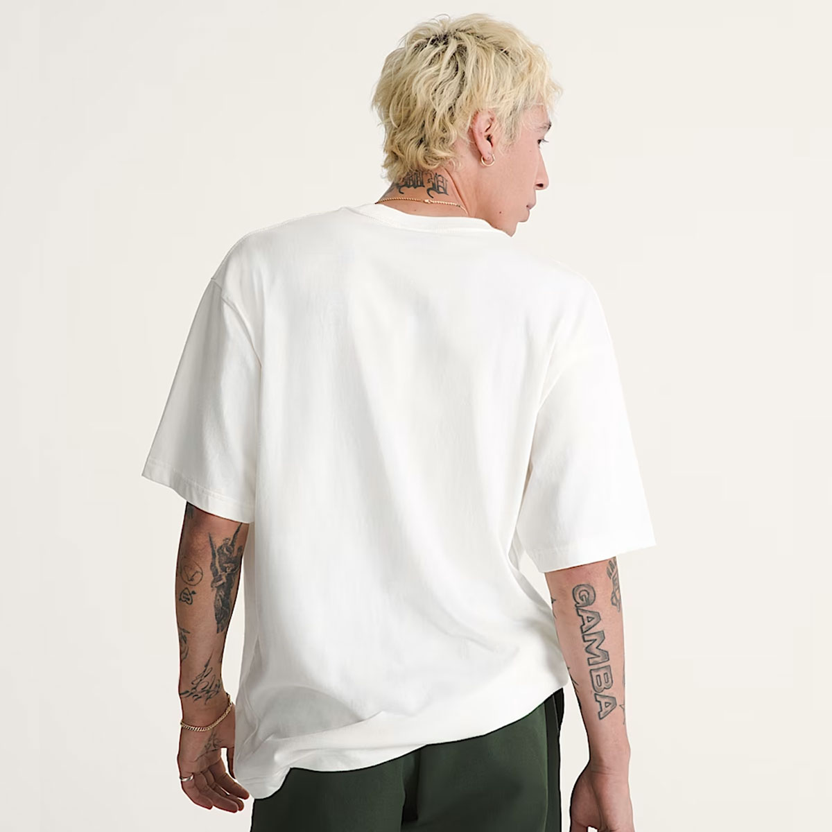Áo sở hữu dáng rộng (relaxed fit) với cấu trúc vai và thân thoải mái, giúp chuyển động linh hoạt. Phần cổ áo bo gân được hoàn thiện chắc chắn, giữ form tốt sau thời gian dài sử dụng. Kỹ thuật nhuộm quá mức (overdye) tạo hiệu ứng màu sắc hơi bạc nhẹ, mang lại cảm giác tự nhiên và bề mặt có chiều sâu hơn.