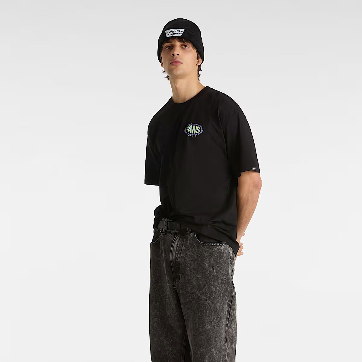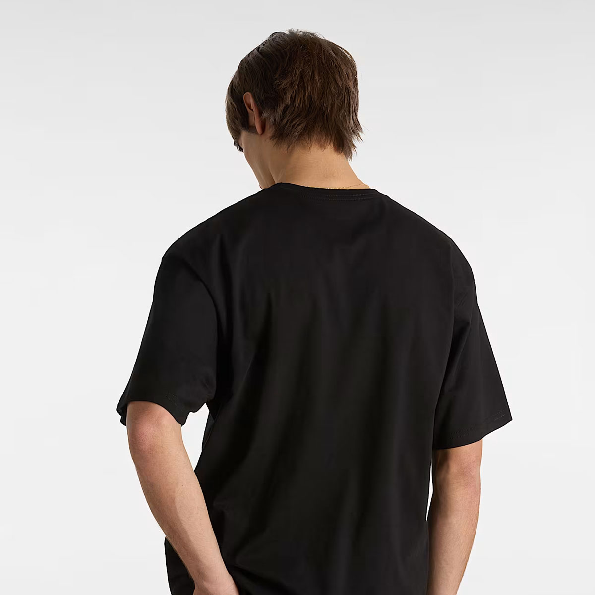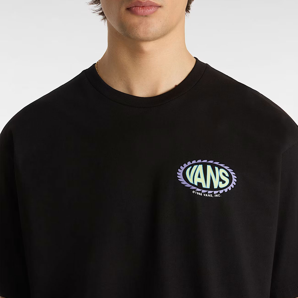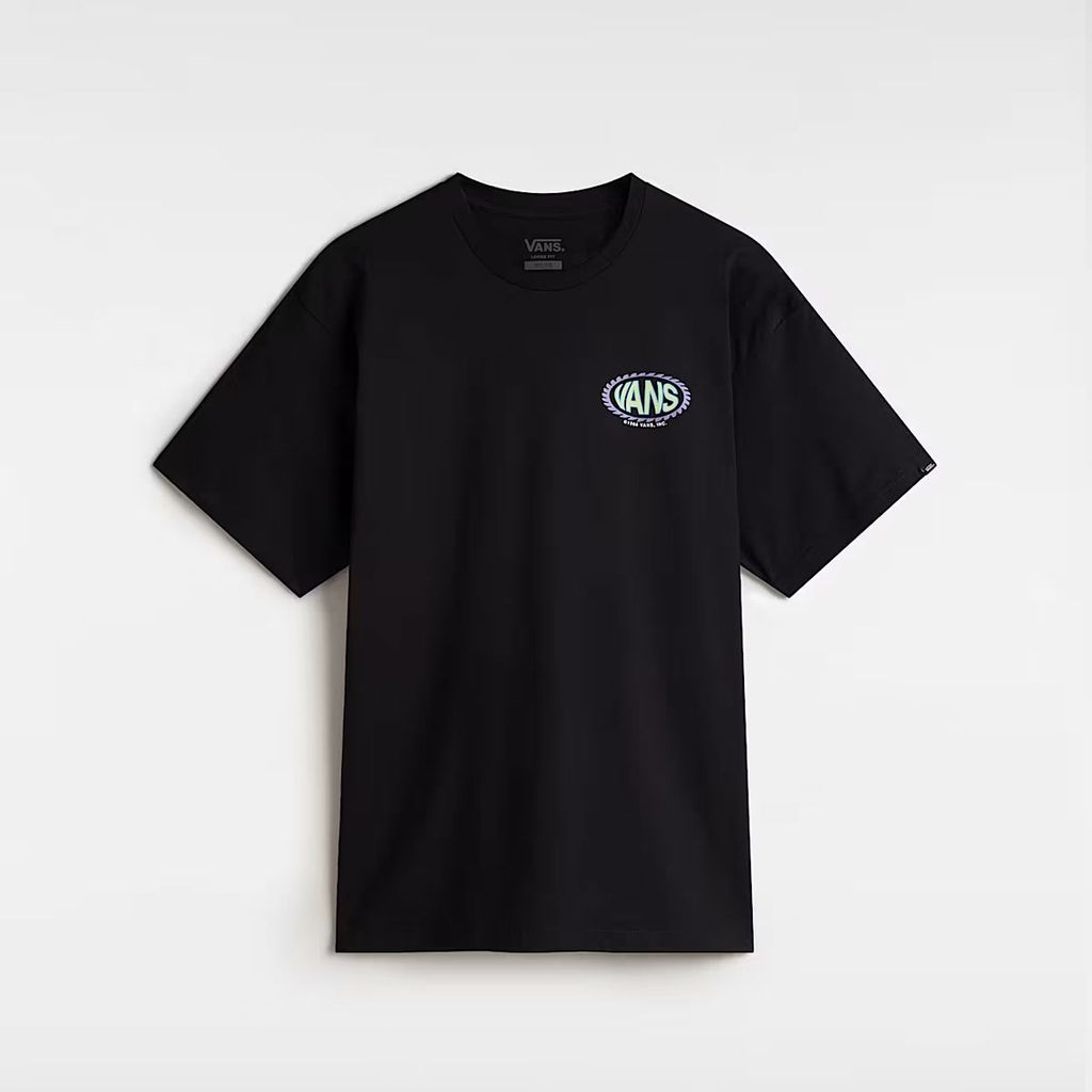 Thiết kế cổ tròn, tay ngắn cùng phom dáng cổ điển giúp dễ dàng phối hợp với mọi outfit – từ streetwear năng động đến casual đơn giản. Nổi bật trên nền màu đen basic là họa tiết logo Vans in lụa sắc nét trước ngực trái, tạo điểm nhấn tinh tế mà vẫn giữ trọn tinh thần “Off The Wall”.