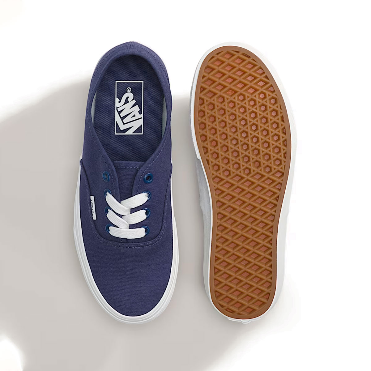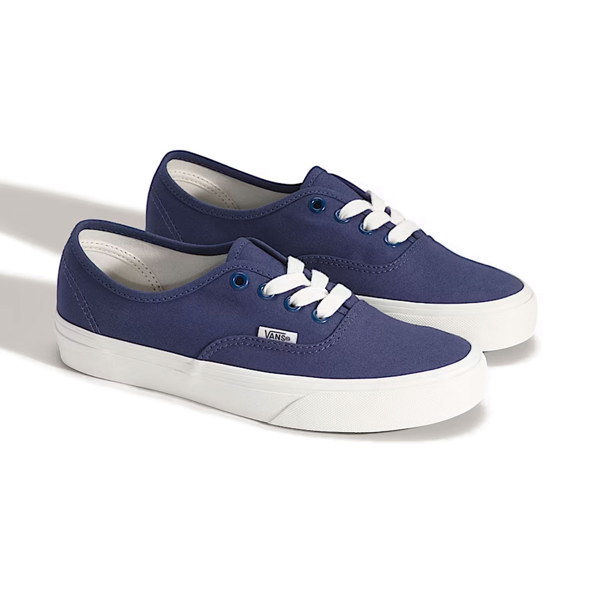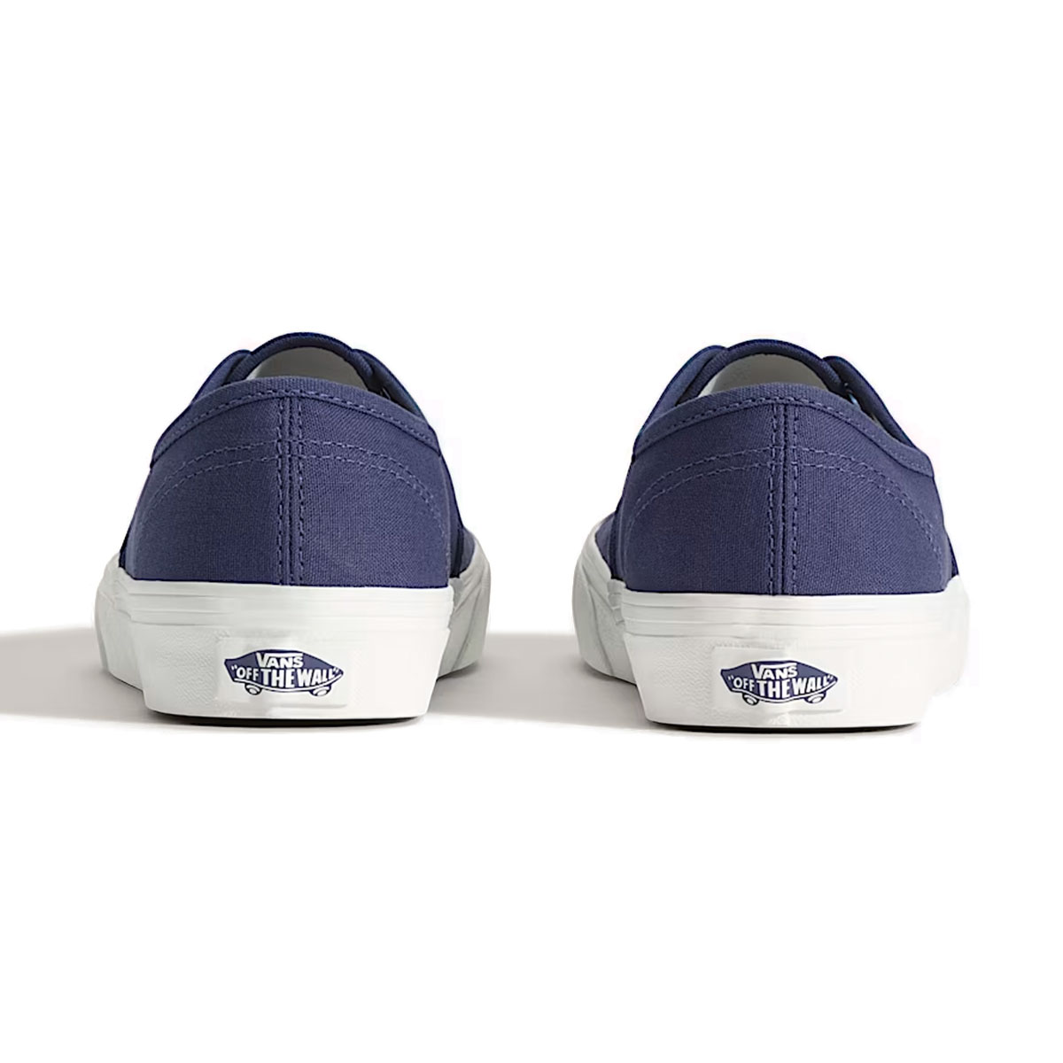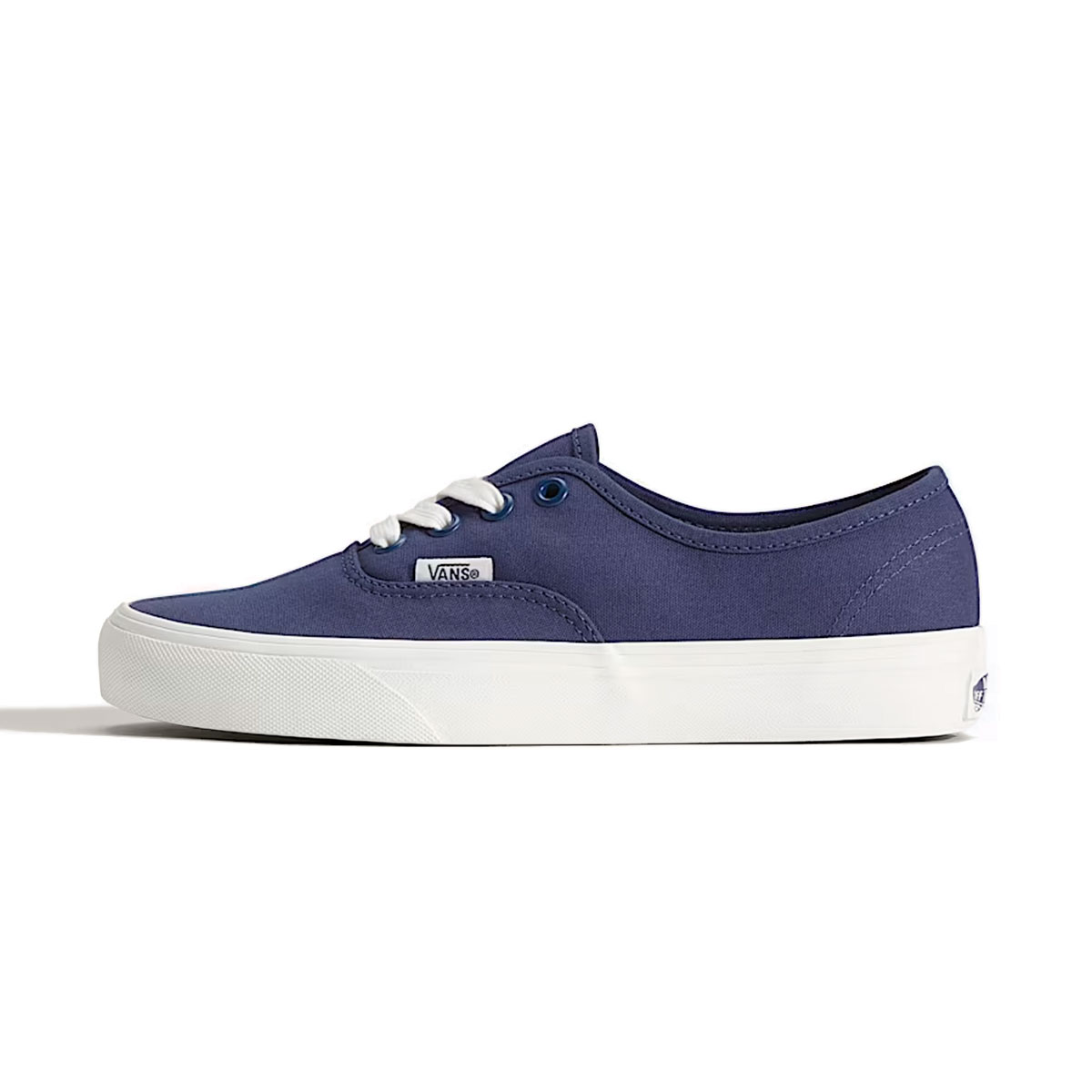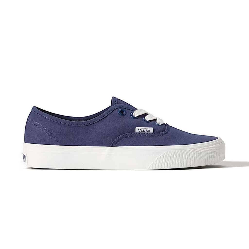 Phần upper 100% canvas mang lại bề mặt vải bền chắc, đứng form, với tông Deep Twilight xanh đậm tạo chiều sâu và cảm giác sạch sẽ cho tổng thể. Các mảng vải được may liền mạch, đường chỉ đều và gọn, giúp đôi giày giữ phom ổn định theo thời gian. Cổ giày không đệm nhưng vẫn tạo cảm giác thấp, nhẹ và sát chân. Điểm nhấn nổi bật nằm ở dây giày trắng bản tròn, tạo độ tương phản rõ rệt trên nền canvas xanh đậm. Dây giày đi kèm lỗ xỏ kim loại chắc chắn, giúp thao tác buộc gọn gàng. Phần nhãn Vans nhỏ được đặt bên hông thân giày, giữ đúng nhận diện tối giản của dòng Authentic. Phần thành giày và đế giữa bằng cao su trắng với sọc viền cổ điển giúp cân bằng màu sắc tổng thể. Đế ngoài waffle đặc trưng của Vans tiếp tục mang lại độ bám ổn định, kết hợp cùng cấu trúc lưu hóa cho cảm giác mang nguyên bản và độ linh hoạt quen thuộc.
