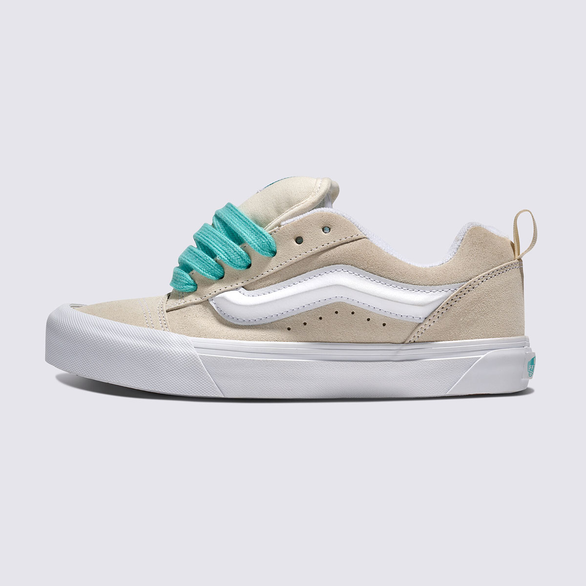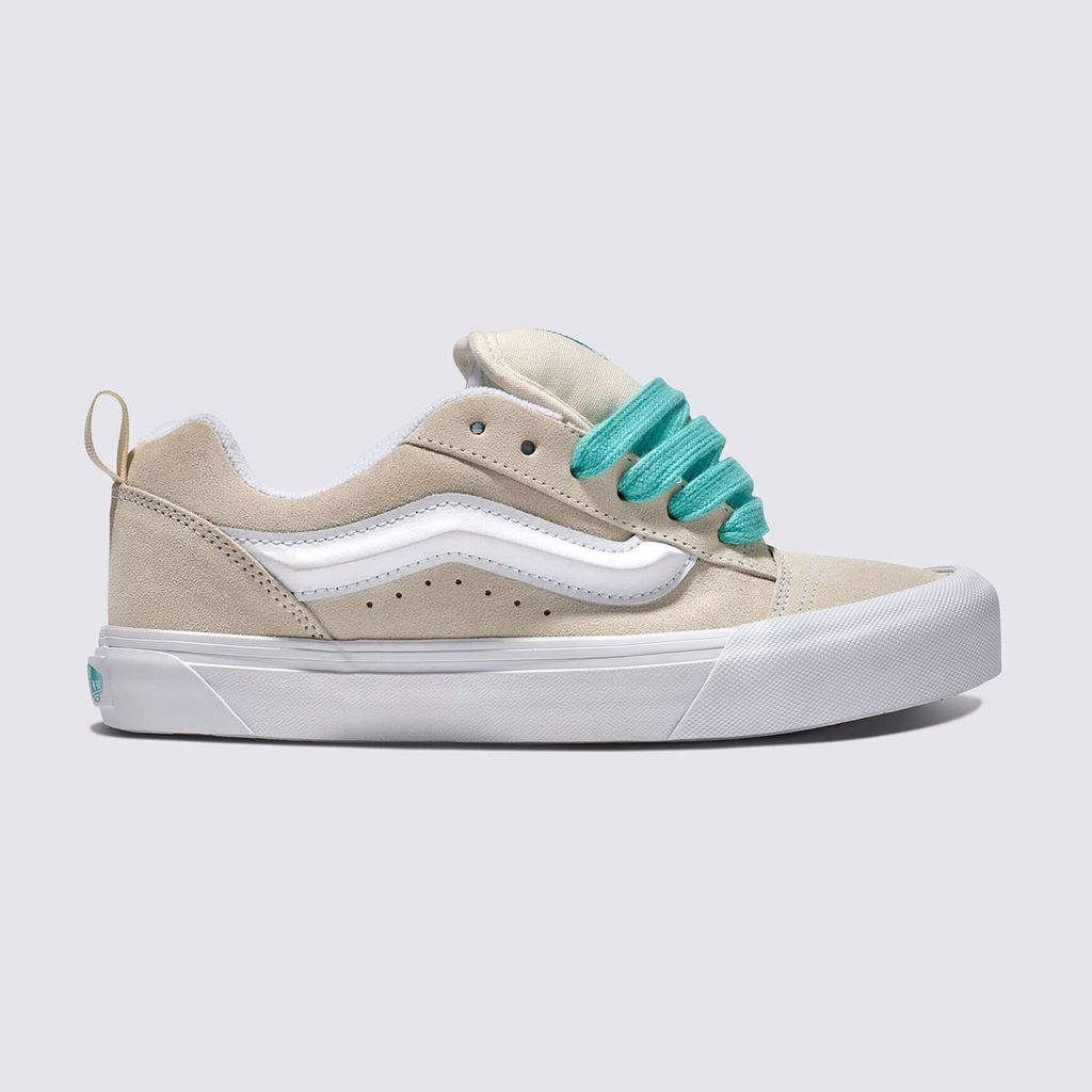 Knu Skool Pop Lace Cream mang phong cách chunky retro quen thuộc của Vans, nổi bật với upper da lộn màu Cream, làm nền cho những chi tiết “Pop” đầy cá tính. Điểm nhấn nằm ở dây giày phồng bản to với sắc xanh ngọc bắt mắt, kết hợp cùng lưỡi gà dày và cổ giày đệm êm, mang đến cảm giác thoải mái khi mang.