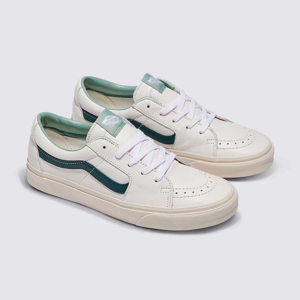 Đôi giày Vans SK8-Low Premium Leather Green Gables là sự kết hợp tinh tế giữa thiết kế cổ điển và chất liệu da thật 100%. Với thiết kế cổ thấp, đôi giày này có màu trắng chủ đạo, kết hợp với dải logo Sidestripe™ màu Green Gables nổi bật. Phần cổ chân được trang bị thêm lớp lót đệm, mang lại sự êm ái và hỗ trợ tối đa cho bàn chân. Đôi giày còn có lỗ thông hơi ở phần đầu, giúp tăng cường sự thoáng khí và giữ cho chân luôn khô ráo. Những đường chỉ may tỉ mỉ không chỉ tạo điểm nhấn thẩm mỹ mà còn góp phần gia tăng độ bền cho giày. Phần đế Waffle đặc trưng của Vans, làm từ cao su, tạo độ bám tốt và cảm giác thoải mái khi di chuyển. Logo Vans được gắn ở phần lưỡi giày, tạo nên dấu ấn thương hiệu đặc trưng. Vans SK8-Low Premium Leather Green Gables phù hợp cho những ai tìm kiếm sự kết hợp giữa phong cách, sự thoải mái và độ bền.