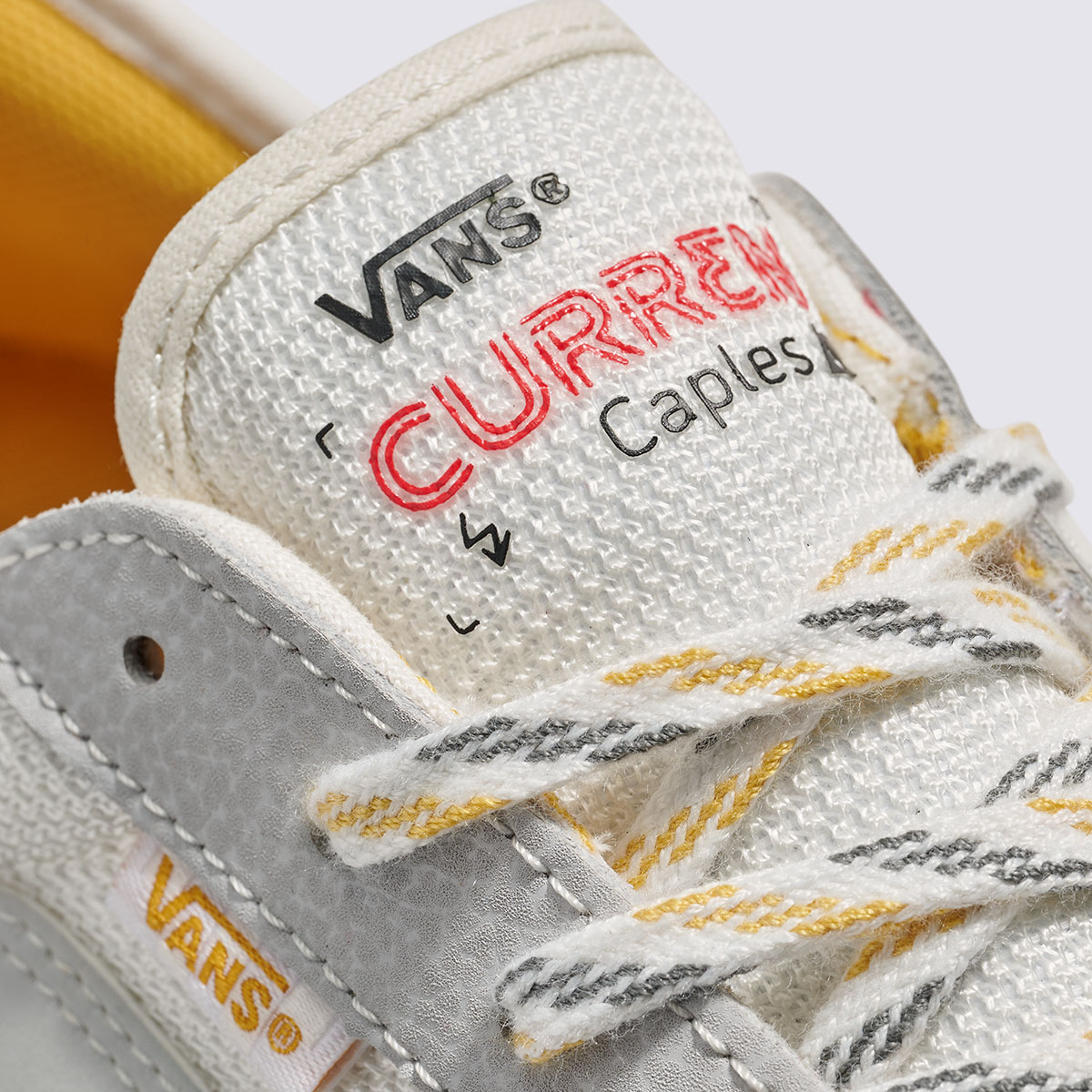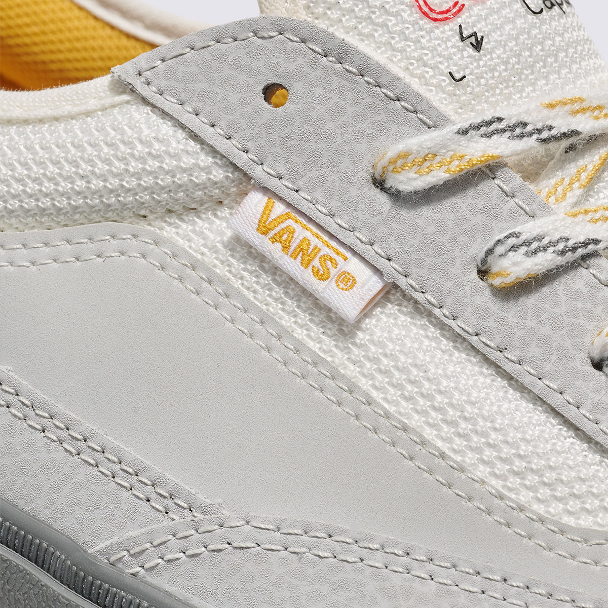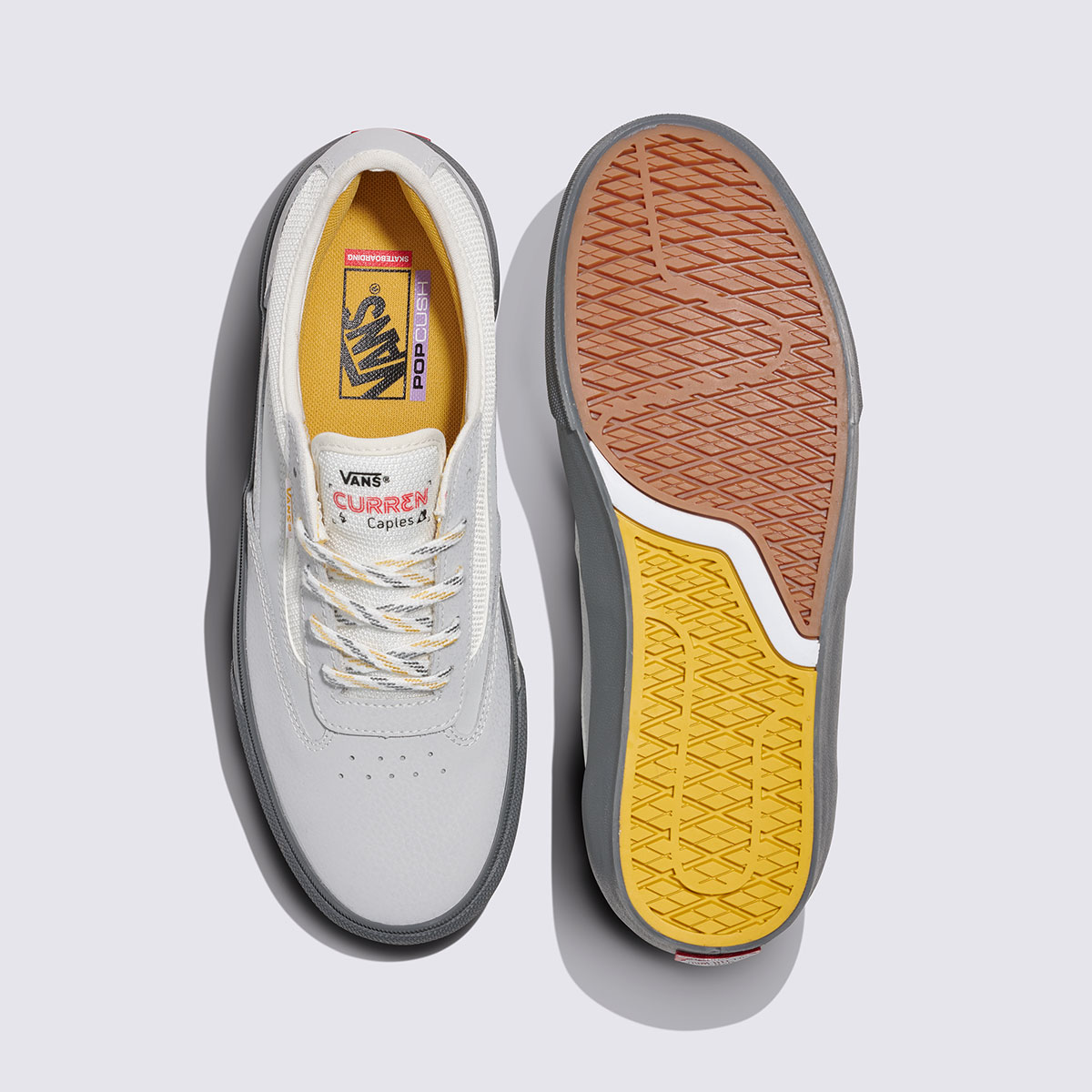 Chất liệu phối hợp giữa da trơn, vải lưới và cao su tổng hợp mang lại vẻ ngoài bền bỉ và linh hoạt. Cổ giày có đệm, đi kèm hệ thống buộc dây cổ điển để ôm chân chắc chắn. Chi tiết nhận diện như logo Vans Skateboarding ở gót, họa tiết SideStripe™ cùng dấu ấn Vans x Curren Caples trên lưỡi gà.