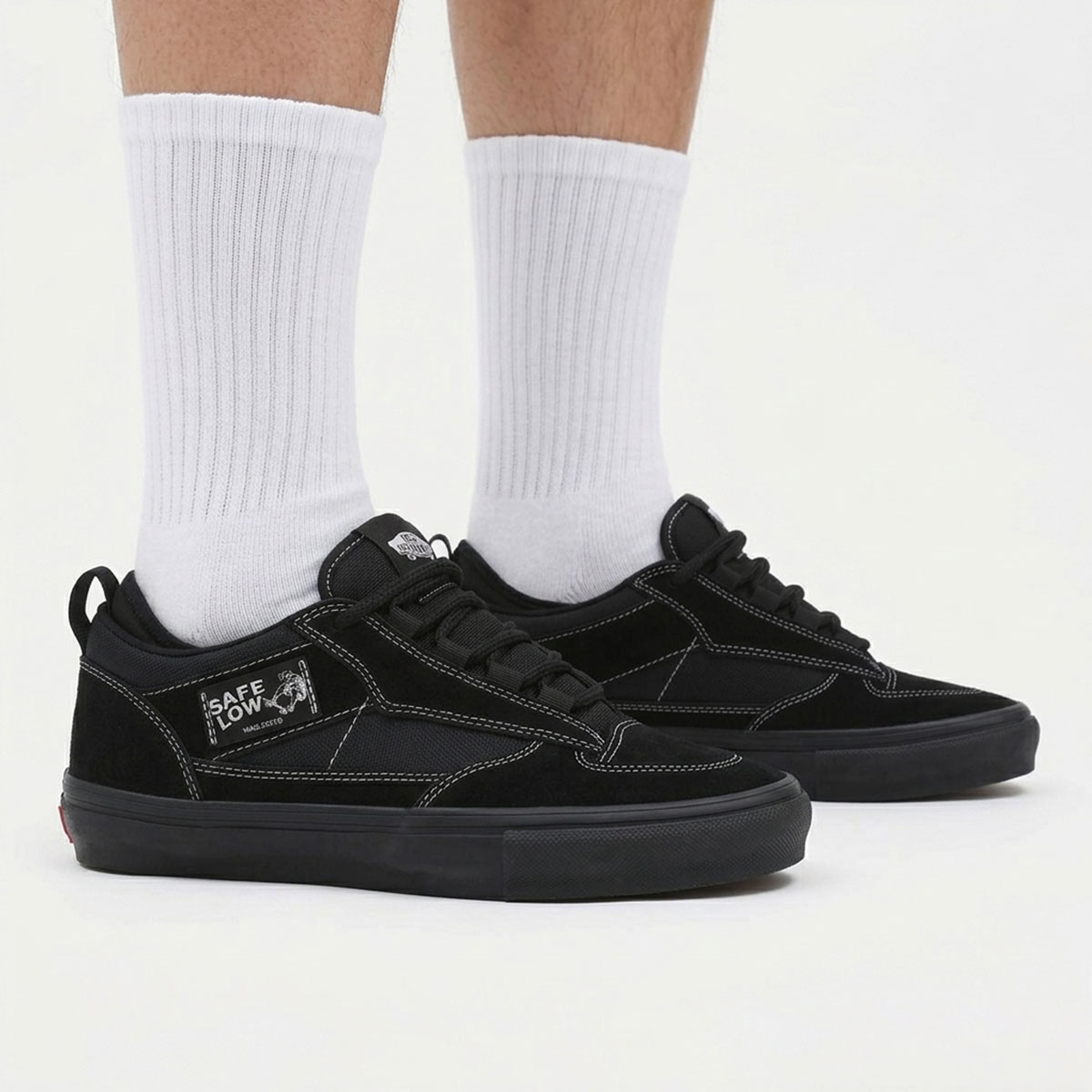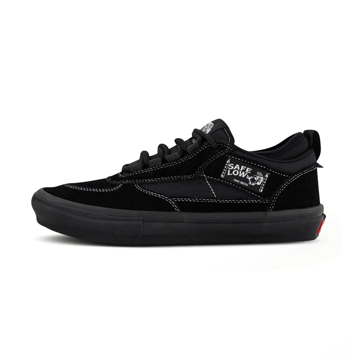 Vans Skate Safe Low là mẫu giày trượt ván mới được phát triển cùng Palace, lấy cảm hứng từ những thiết kế kinh điển như Half Cab và MC 96. Đôi giày mang phom low-top gọn gàng, kết hợp tổng thể màu đen với các đường chỉ tương phản, tạo điểm nhấn rõ nét và làm nổi bật cấu trúc nhiều lớp trên thân giày. Upper được cấu thành từ Leather và Textile, mang lại sự cân bằng giữa độ bền, độ ôm và khả năng linh hoạt.