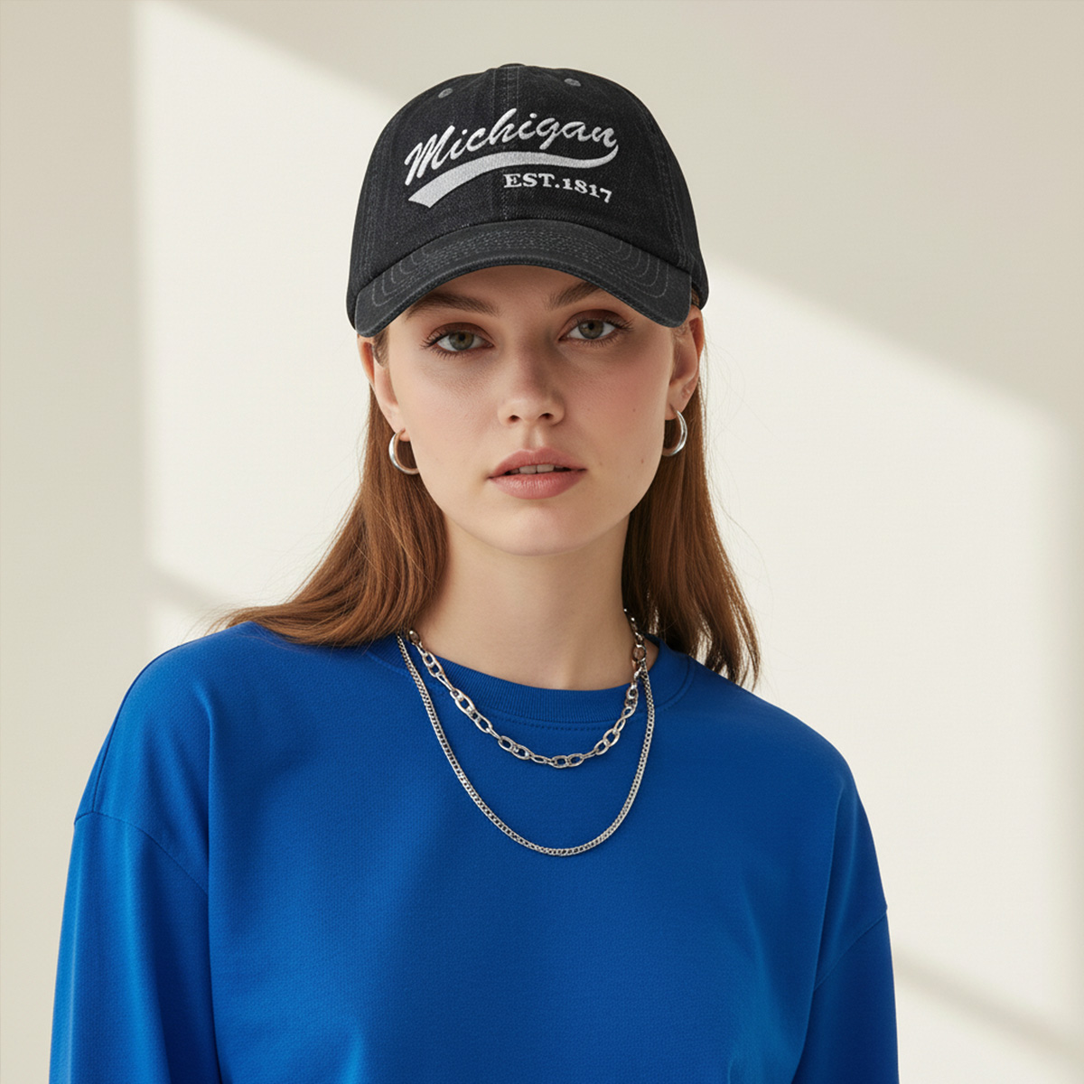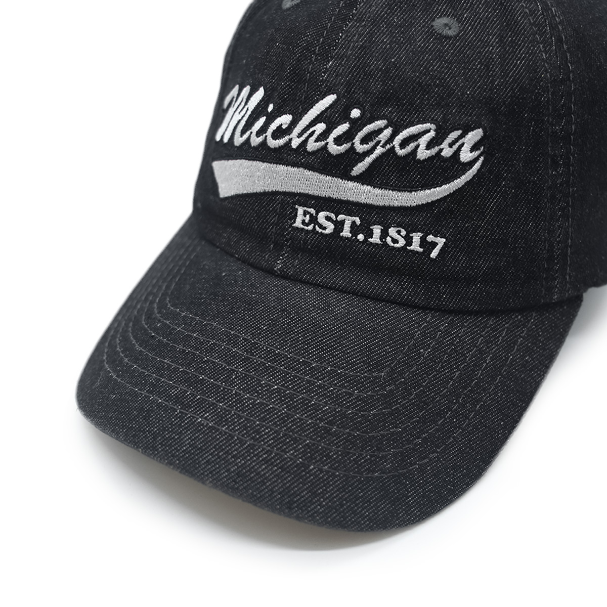 Chiếc nón NCAA Michigan mang kiểu dáng lưỡi trai cổ điển, được làm từ chất vải denim dày dặn với tông xám đậm mang lại cảm giác vừa cổ điển vừa cá tính. Phần mặt trước nổi bật với logo “Michigan” thêu nổi kiểu chữ viết tay cùng dòng chữ “EST. 1817” bên dưới – gợi nhớ tinh thần đại học Mỹ đặc trưng của dòng phụ kiện NCAA.